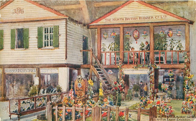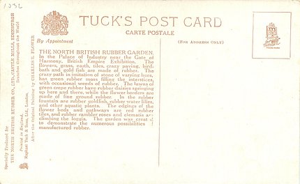 back:- THE NORTH BRITISH RUBBER GARDEN IN THE PALACE OF INDUSTRY NEAR THE GATE OF HARMONY, BRITISH EMPIRE EXHIBITION much information about the garden which was made of rubber