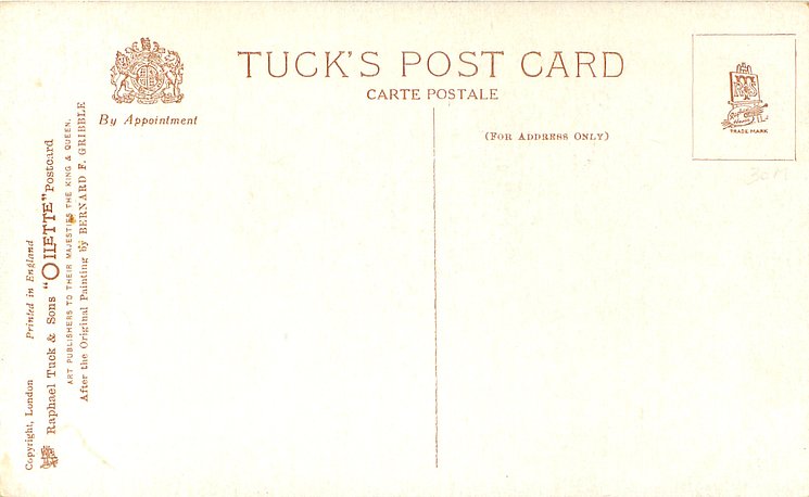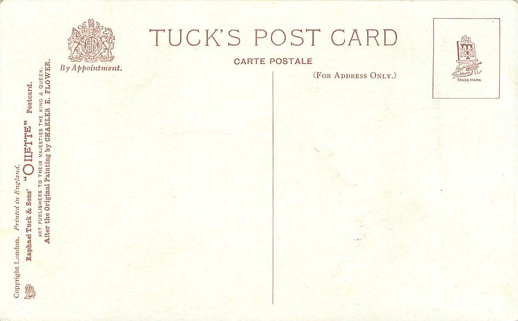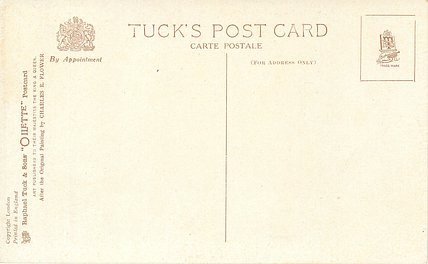 PRINTED IN ENGLAND BY RAPHAEL TUCK & SONS LTD. Oilfacsim but not so trade-named, comes with three slightly different backs see Perkins & Tonkin