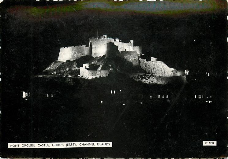 Comes as JY121 normal size card with title MONT ORGUEIL CASTLE (FLOODLIT), GOREY