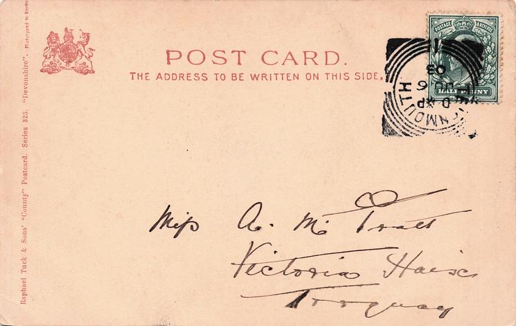 grey black, COUNTY, DEVON or DEVONSHIRE on back of card, u/b or d/b, PHOTOTYPED IN BERLIN, listed in 1904 postcard Catalogue, same images i.n. 2150-2155