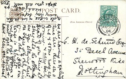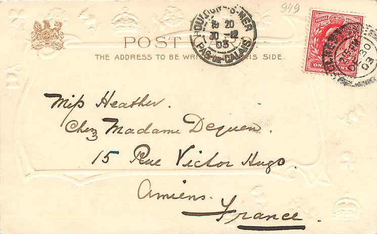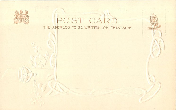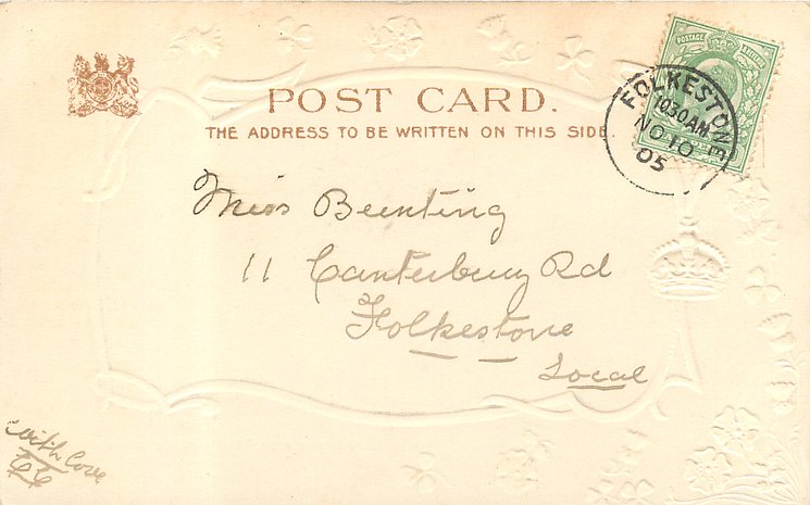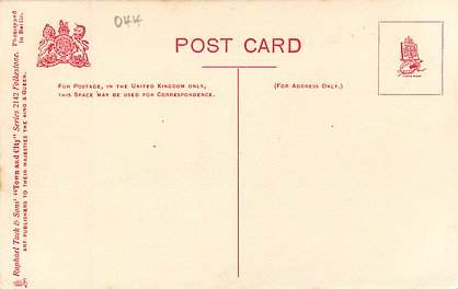 u/b, gilt embossed, shades of green background, DESIGNED IN ENGLAND, PHOTOTYPED IN BAVARIA, listed in RAPHAEL TUCK & SONS' LD. CHRISTMAS & NEW YEAR 1904/1905 catalogue