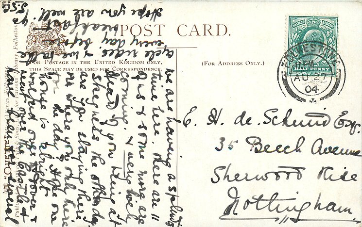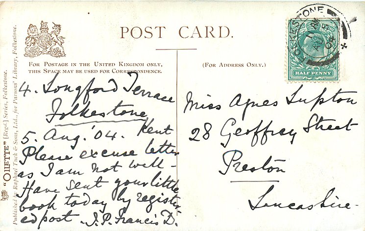OILETTE, PUBLISHED BY RAPHAEL TUCK & SONS, LTD., FOR PARSONS' LIBRARY, FOLKESTONE.
