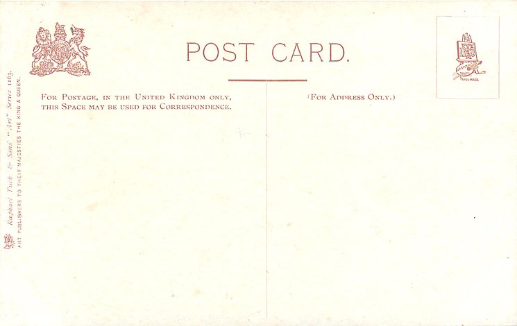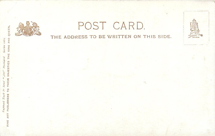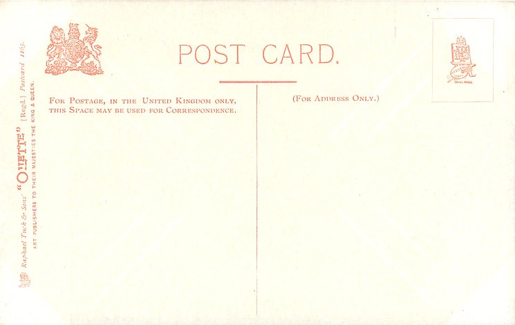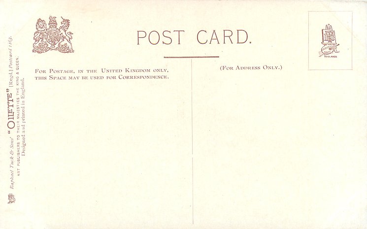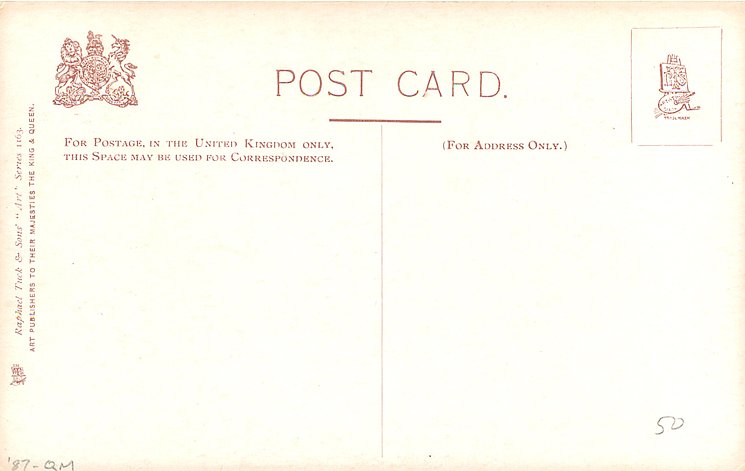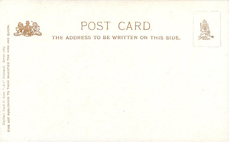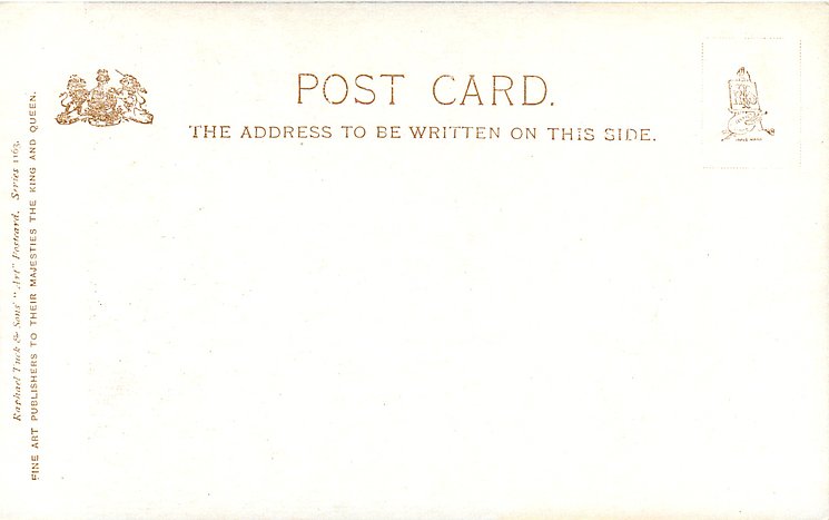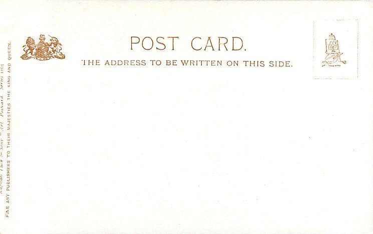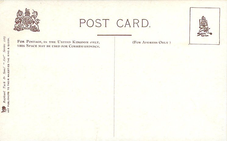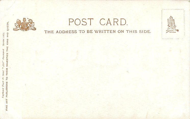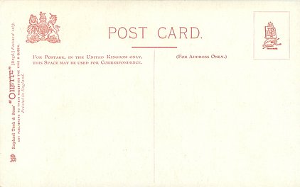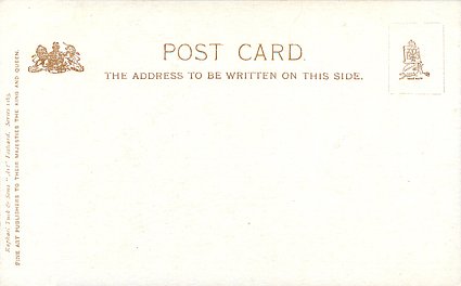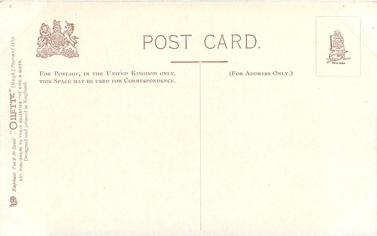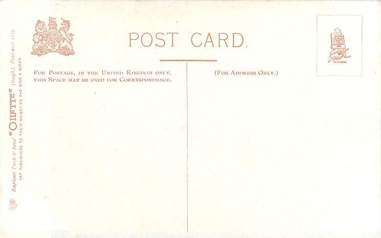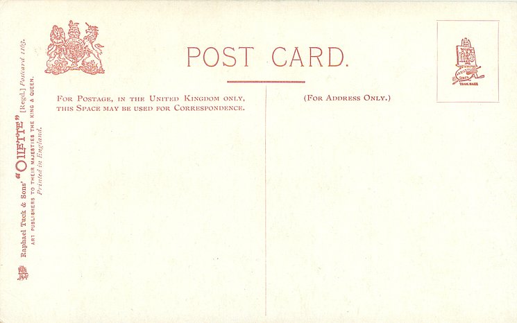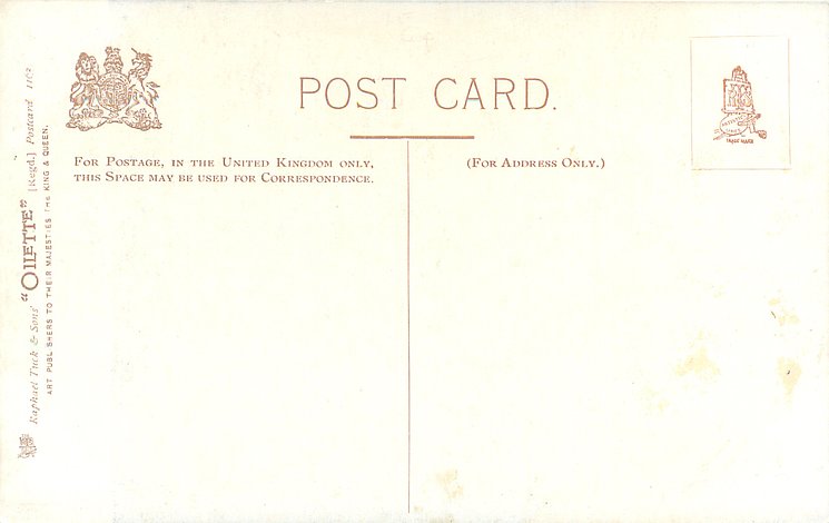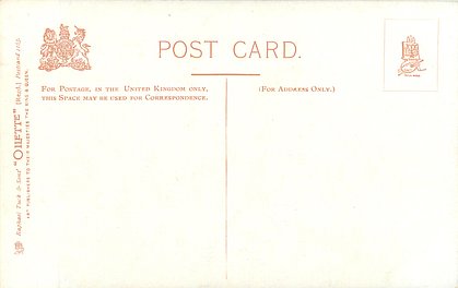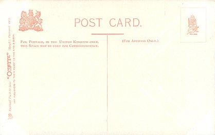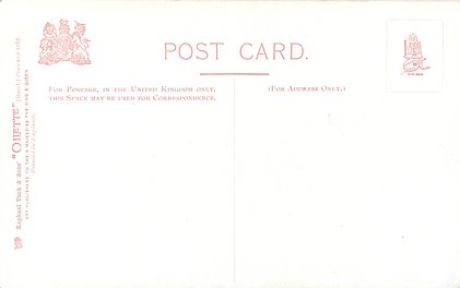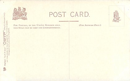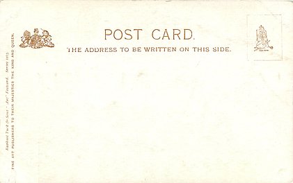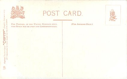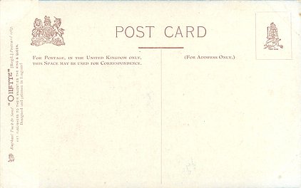 OILETTE or ART (u/b), 5 backs, u/b or d/b, PRINTED IN ENGLAND or not, come with & w/o white border for inscriptions, listed in 1904 & 1908/1909 & 1911/1912 Postcard Catalogues. 6 Cards in set cover all had white border with title.