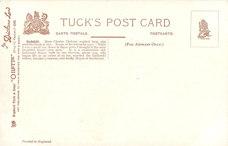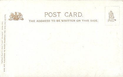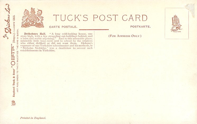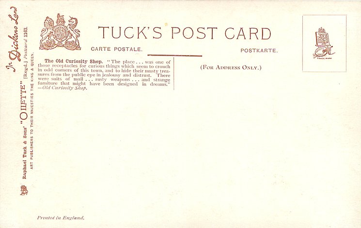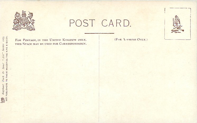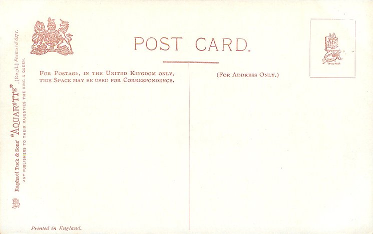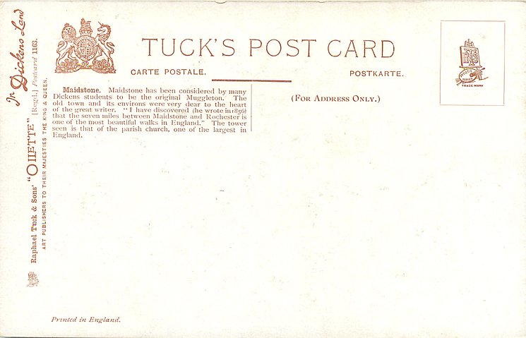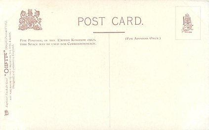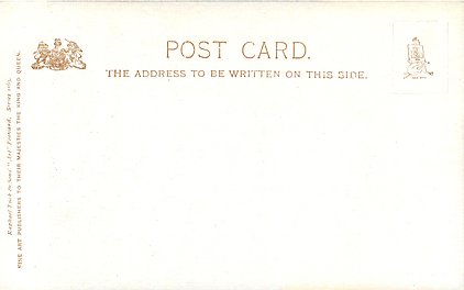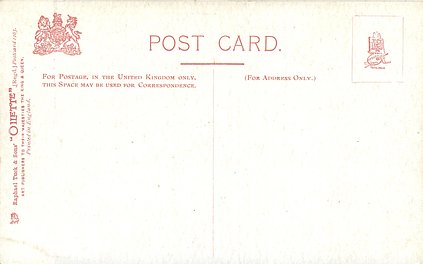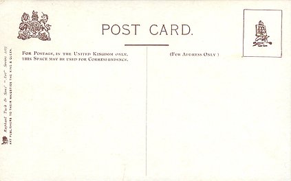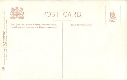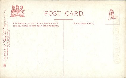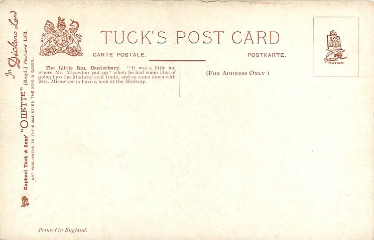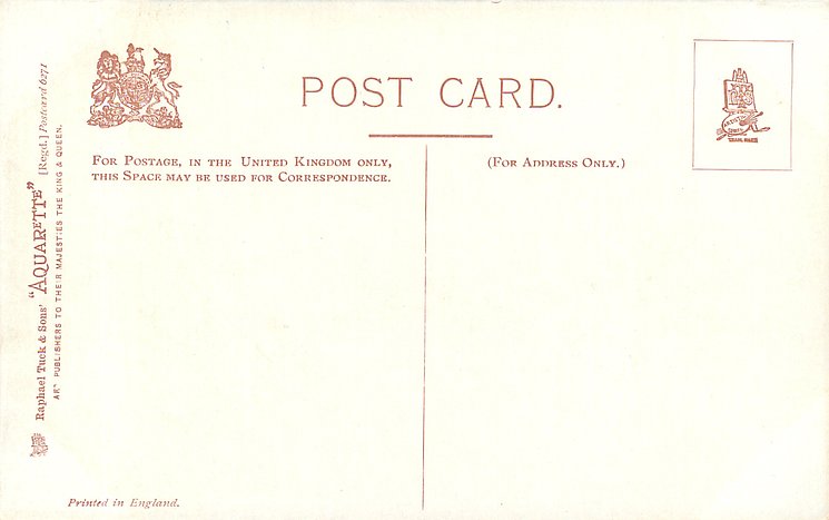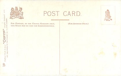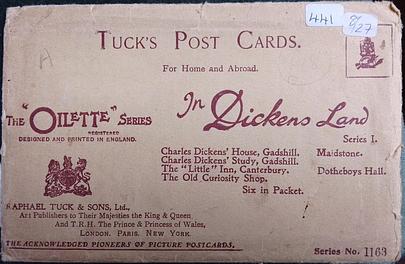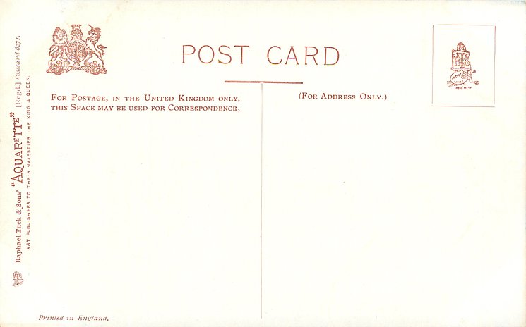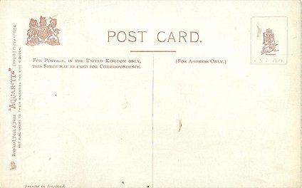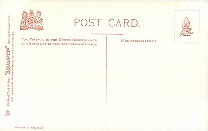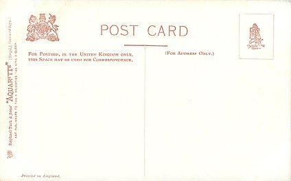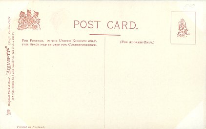 AQUARETTE, PRINTED IN ENGLAND, listed as ART in 1908/1909 & 1911/1912 Postcard Catalogue, listed as DICKENS in 1908/1909 Catalogue