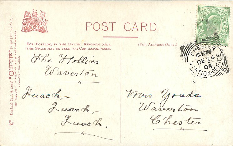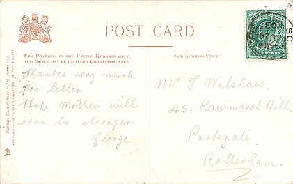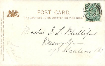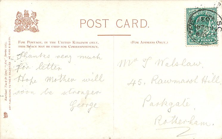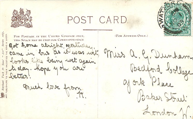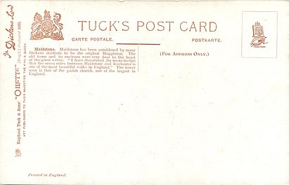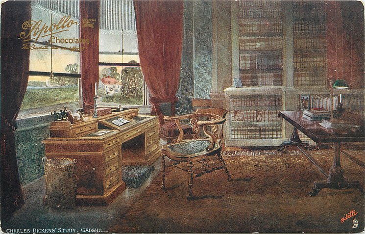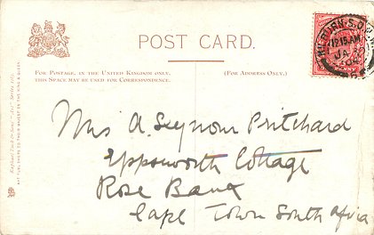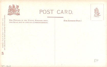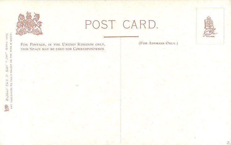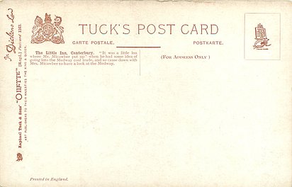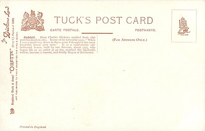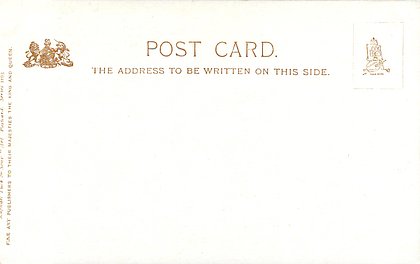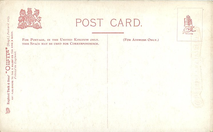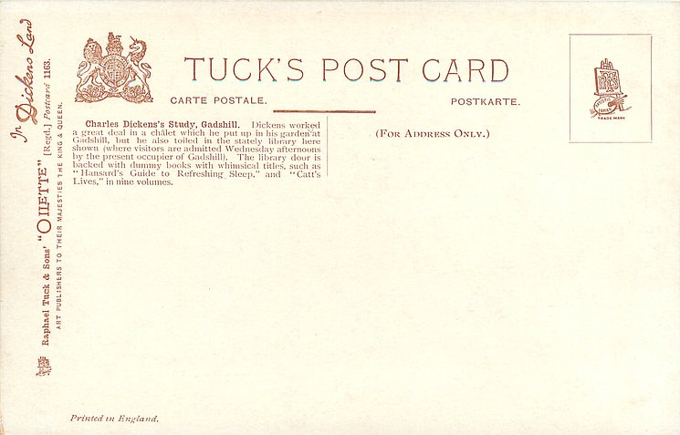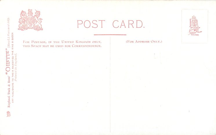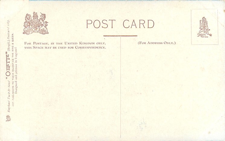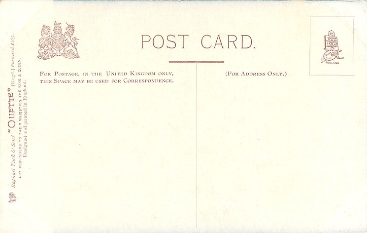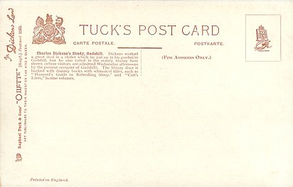 AQUARETTE, PRINTED IN ENGLAND, listed as ART in 1908/1909 & 1911/1912 Postcard Catalogue, listed as DICKENS in 1908/1909 Catalogue
