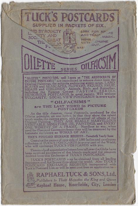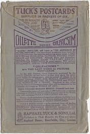 OILETTE, PRINTED IN ENGLAND, with or w/o COPYRIGHT LONDON, comes oilfacsim but not so trade named, 6 backs, listed in 1908/1909 & 1911/1912 & 1930 Postcard Catalogues, listed in TUCK'S TRAVELOGUES (USA?1905)