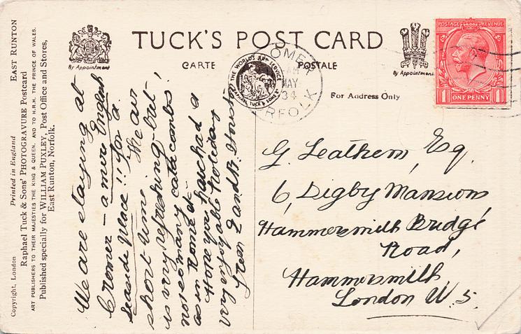 PHOTOGRAVURE, come hand-coloured, PRINTED IN ENGLAND, COPYRIGHT LONDON, PUBLISHED SPECIALLY FOR WILLIAM PUXLEY, POST OFFICE AND STORES, EAST RUNTON, NORFOLK.
