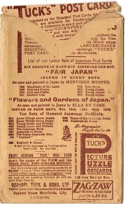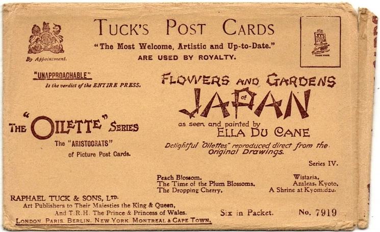 OILETTE, PRINTED IN ENGLAND, SOUVENIR JAPAN-BRITISH EXHIBITION 1910 on packet & cards, FROM "JAPAN," ILLUSTRATED BY ELLA DU CANE (A. & C. BLACK), listed in 1911/1912 & 1913/1914 Postcard Catalogues