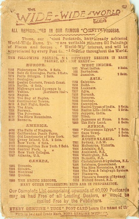 OILETTE, WIDE-WIDE-WORLD, PROCESSED IN PARIS (in stamp box), card titles on back OILETTE, listed in 1908/1909 & 1911/1912 Postcard Catalogue, same images French backs SERIE 937 OILETTE