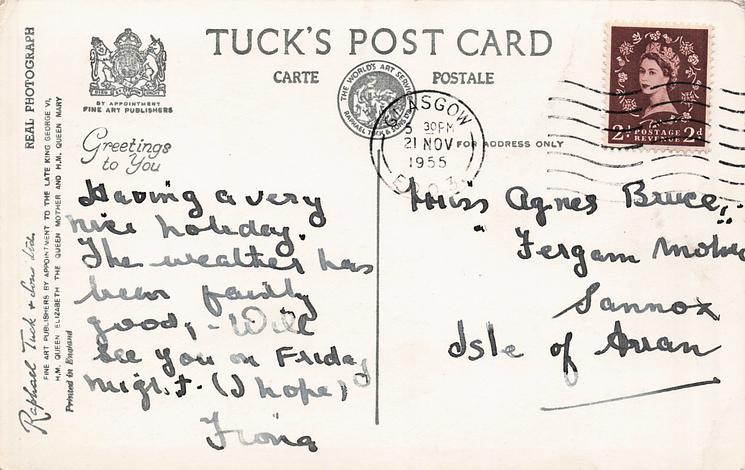 grey, PRINTED IN ENGLAND, COPYRIGHT, LONDON, UNDER THE DIRECTION OF ARTHUR TOWLE, CONTROLLER, L.M.S. HOTEL SERVICES, ST. PANCRAS, N.W. 1 for more information see The Official Railway Postcard Book by John Alsop