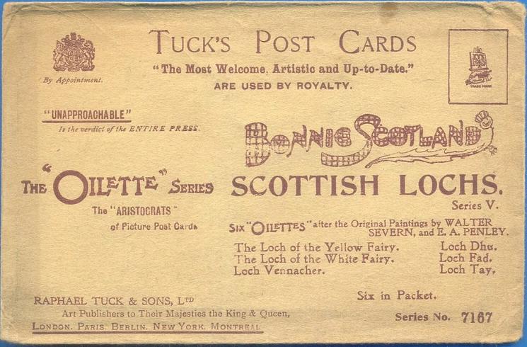 OILETTE, PRINTED IN ENGLAND and UNITED KINGDOM, with & w/o COPYRIGHT LONDON, comes also with series title SCOTCH LOCHS, comes oilfacsim but not so trade named, 7 backs, listed in 1908/1909 & 1911/1912 &1930 POSTCARD Catalogues & 1932 ART SERVICE Catalogue