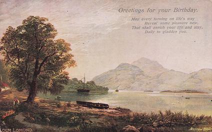 OILETTE, PRINTED IN THE UNITED KINGDOM, COPYRIGHT LONDON, comes opt. in red and blue AMERICAN Y.M.C.A.,same images SCOTTISH LOCHS SERIES IV 7166, & with greetings: bday 1924 & Xmas 6041