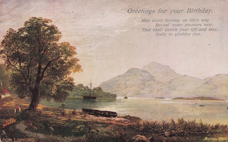 comes opt. in grey: GREETINGS FOR YOUR BIRTHDAY with verse MAY EVERY TURNING ON LIFE'S WAY REVEAL SOME PLEASURE NEW, THAT SHALL ENRICH YOUR LIFE AND STAY DAILY TO GLADDEN YOU.