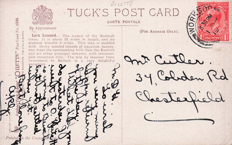 OILETTE, PRINTED IN THE UNITED KINGDOM and ENGLAND, with & w/o COPYRIGHT LONDON, comes OILFACSIM with O.F. prefixes and oilfacsim but not so trade named, also with series title SCOTCH LOCHS, comes opt. in red and blue AMERICAN Y.M.C.A.,10 backs, , listed in 1908/1909 & 1930 POSTCARD Catalogue & 1932 ART SERVICE Catalogue, same images with greetings: b'day 1349,1924 & Xmas 6041, 6042 & 7441. The Oilfacsim set cover has a blue label stuck on the front of a manilla set cover.