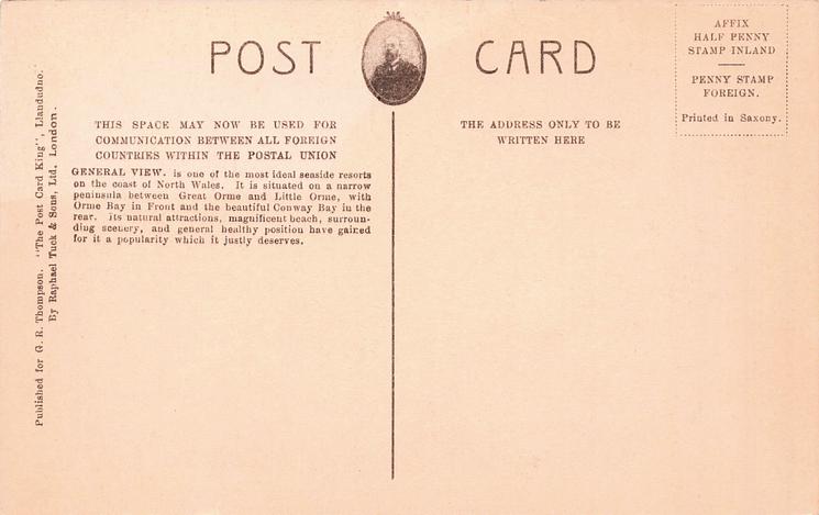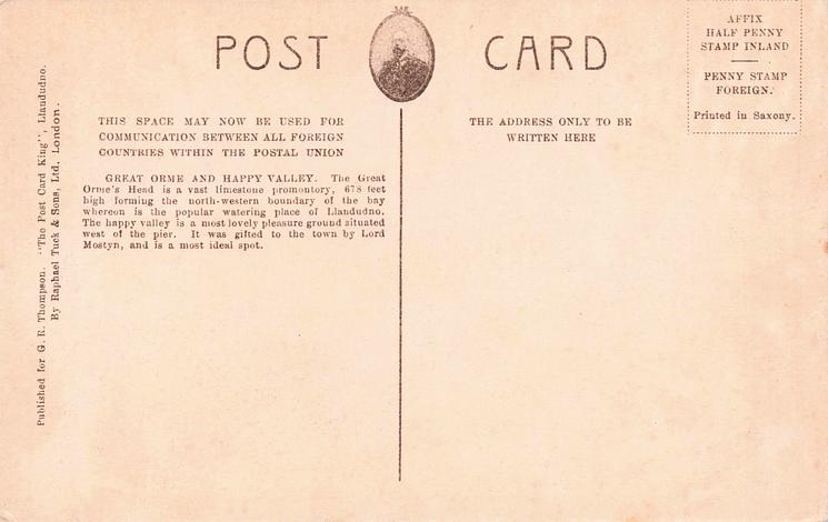PUBLISHED FOR G.R. THOMPSON. "THE POST CARD KING", LLANDUDNO., tiny portrait vignette on back, come hand-coloured & glossy
