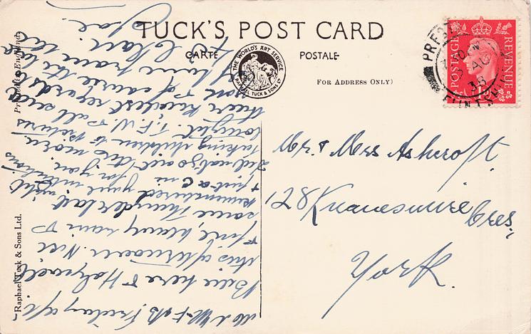 proof RAPHAEL TUCK & SONS, LTD., blue handstamp, COPYRIGHT A.F. SERGEANT in purple crossed out