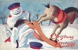two snowman dressed as German soldiers,,one tries to mount wooden horse, officer disapproves