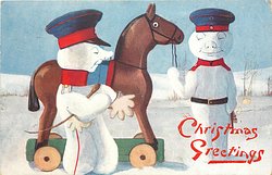 two snowman dressed as German soldiers, each on a wooden horse on wheels