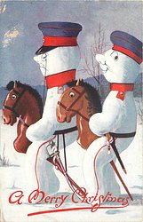 three snowman dressed as German soldiers, each on a wooden horse one jumps a fence