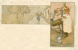 inset of mother & child looking over fence at rose,stylised rural scene behind, buff background