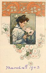 orange/white heart design inset above inset of woman in light blue smelling pink roses, stylised flowers below