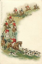 jockeys steeplechasing, one fallen in water, brown horse leads