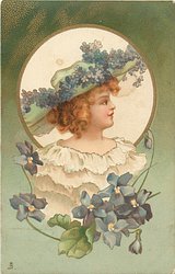 head & sholders study of girl in light blue bonnet tied under her chin, faces left, violets below
