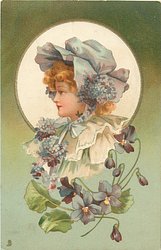 head & sholders study of girl in white bonnet tied under her chin, green bow above, faces front, violets below