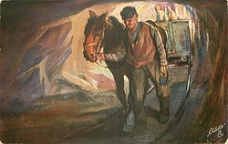 DAS BERGWERK 2.BILD man leads horse pulling rail car in mine