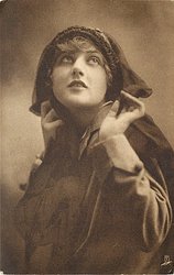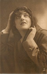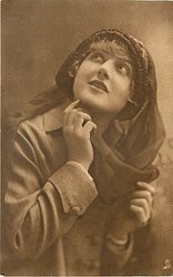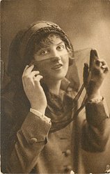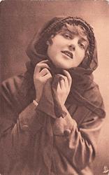 girl in coat & hat prepares for stormy weather, left hand holds flimsy scarf at neck, left hand near face, faces & looks right