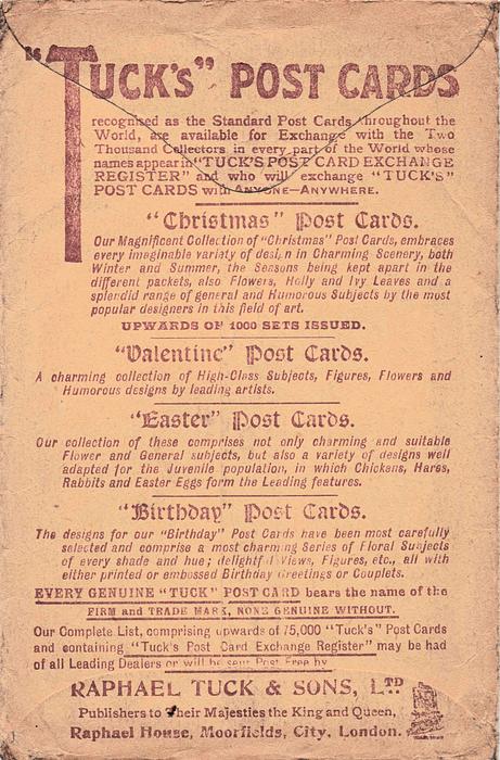 GRAVURE, PRINTED IN THE UNITED KINGDOM, sepia, come hand coloured but not so trade-named, set cover came with no postcards so unsure if it belongs to this set - confirmation needed.