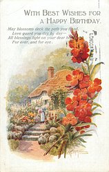 WITH BEST WISHES FOR A HAPPY BIRTHDAY wallflowers, cottage