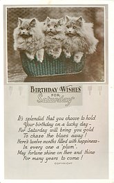 verse:- IT'S SPLENDID THAT YOU CHOOSE TO HOLD YOUR BIRTHDAY ON A LUCKY DAY-FOR SATURDAY WILL BRING YOU GOLD TO CHASE THE BLUES AWAY! HERE'S TWELVE MONTHS FILLED WITH HAPPINESS- IN EVERY ONE A "PLUM". MAY FORTUNE SHINE ON THEE AND THINE FOR MANY YEARS TO COME!