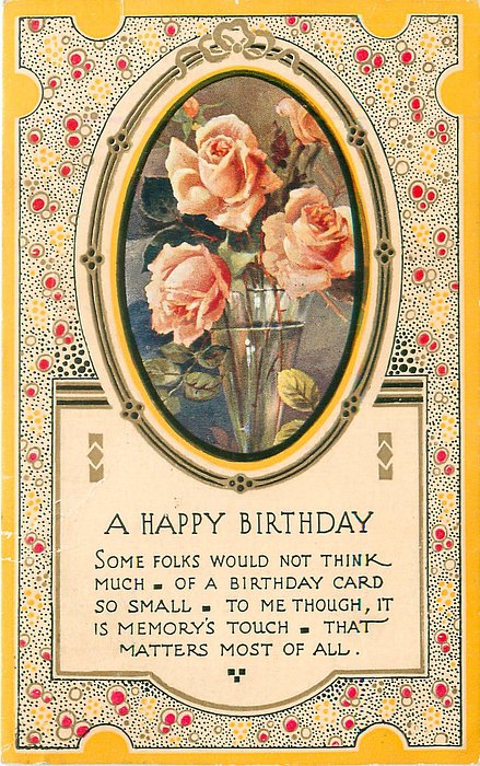 verse:- SOME FOLKS WOULD NOT THINK MUCH-OF A BIRTHDAY CARD SO SMALL-TO ME THOUGH, IT IS MEMORY'S TOUCH-THAT MATTERS MOST OF ALL