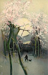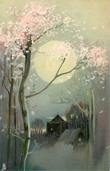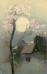 woman & child walk back behind blossom tree to lighted cottage, central large moon