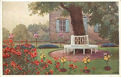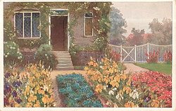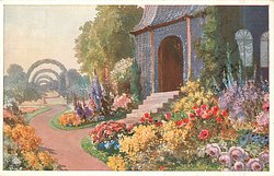 many flowers front & left, house right greenhouses back right, trees further back, blue hydranges front left