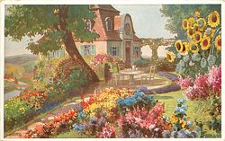 many multicoloured flowers, sunflowers back right, path leading past large tree, table & chairs to house back left
