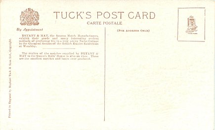 back:- BRYANT & MAY, THE FAMOUS MATCH MANUFACTURERS EXHIBIT THEIR GOODS AND MANY INTERESTING ANCIENT METHODS OF PRODUCUNG FIRE IN A VERY PRETTY TUDOR COTTAGE IN THE CHEMICAL SECTION OF THE BRITISH EMPIRE EXHIBITION AT WEMBLEY. THE REPLICA OF THE MATCHES SUPPLIED BY BRYANT & MAY TO THE QUEEN'S DOLLS' HOUSE IS ALSO ON VIEW. THESE ARE THE SMALLEST MATCHES AND BOXES EVER PRODUCED