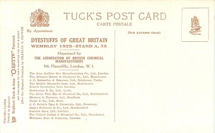 back:- WEMBLEY 1925--STAND A.35 ORGANISED BY THE ASSOCIATION OF BRITISH CHEMICAL MANUFACTURERS 166, PICCADILLY, LONDON, W.1. list of 14 companies