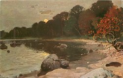 evening scene, rocky shore right, moon over trees