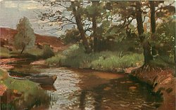 boat moored left, trees right, stream centre