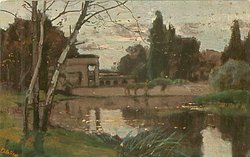 bank front left, water extending left from right front, two birch trees right bank, trees behind