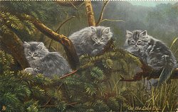 ON THE LOOK OUT three kittens in pine tree