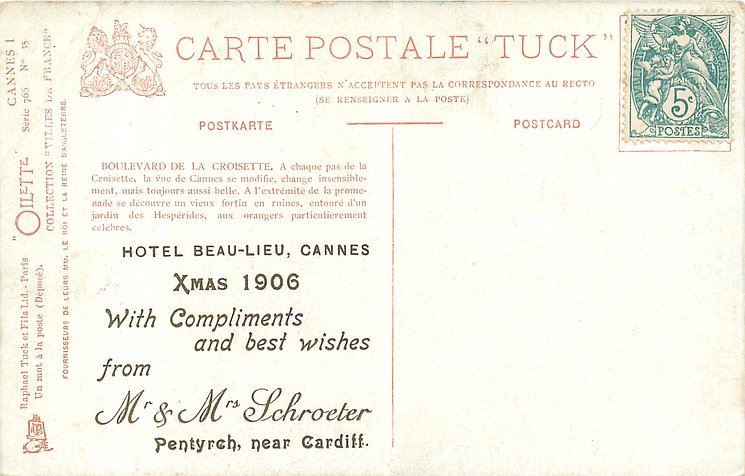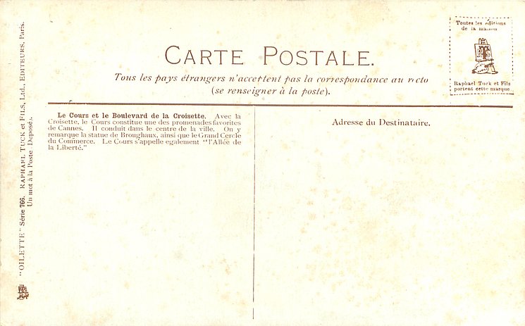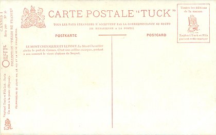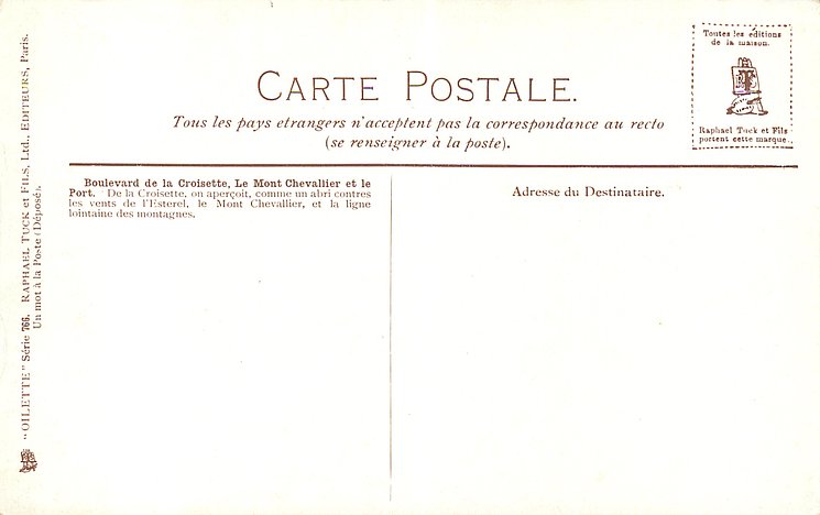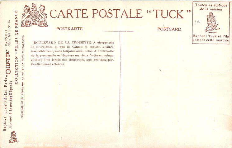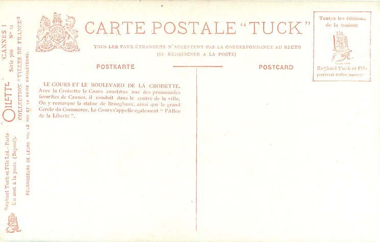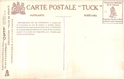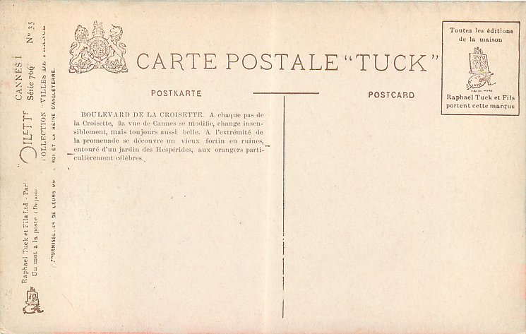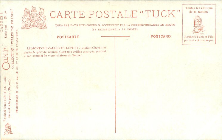OILETTE, UN MOT A LA POSTE (DEPOSE), 5 backs, with or w/o suffix P, with or w/o COLLECTION VILLES DE FRANCE with or w/o inset numbers, same images English backs OILETTE WIDE-WIDE-WORLD 7445 CANNES SERIES I, same images & front titles with German backs as OILETTE 226 B