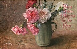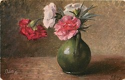 two white, one red, three carmine, one pink in wicker basket, handle visible