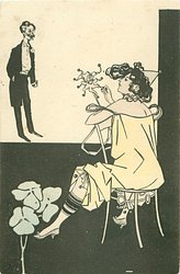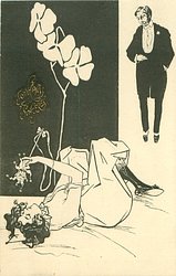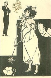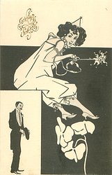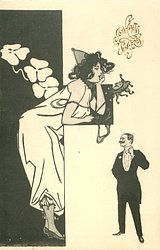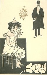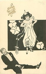 carnavalesque girl manipulates puppets whose faces are those of her admirers