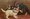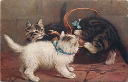 three cats lie on floor, each has ribbon around neck, play with ribboned babies rattle