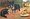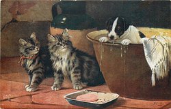 two kittens playing on top of dressing table, one looks in mirror, other plays with powder puff