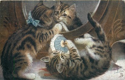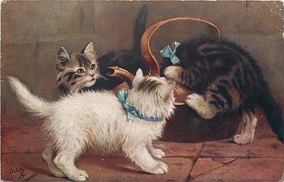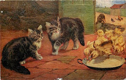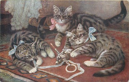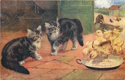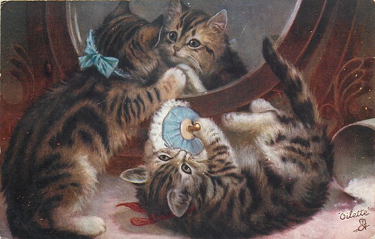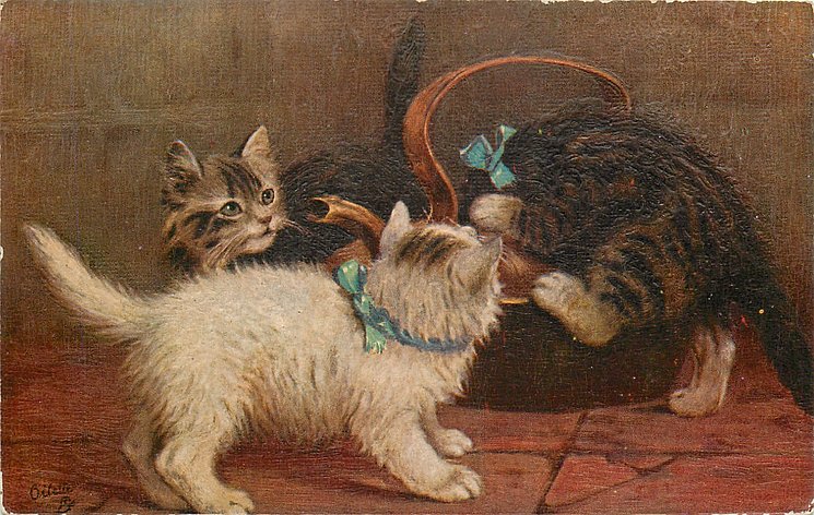 same basic image of cat on left- ephemera greeting card GOOD WISHES , Christmas, artist