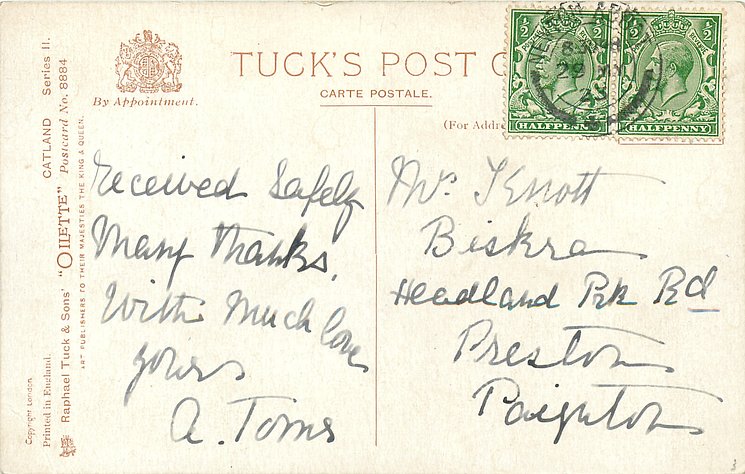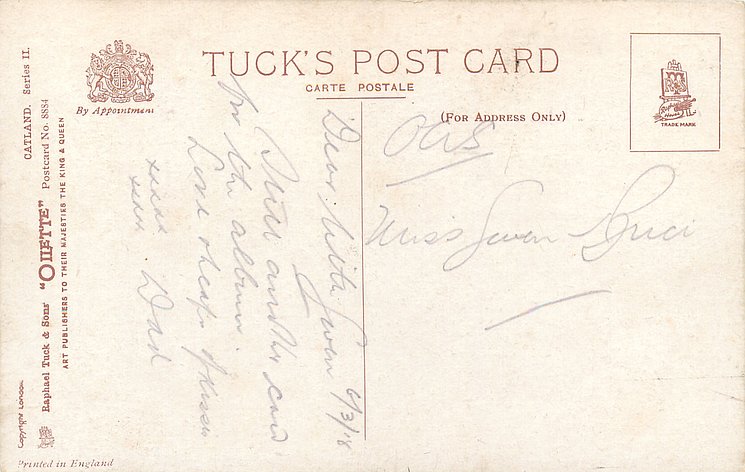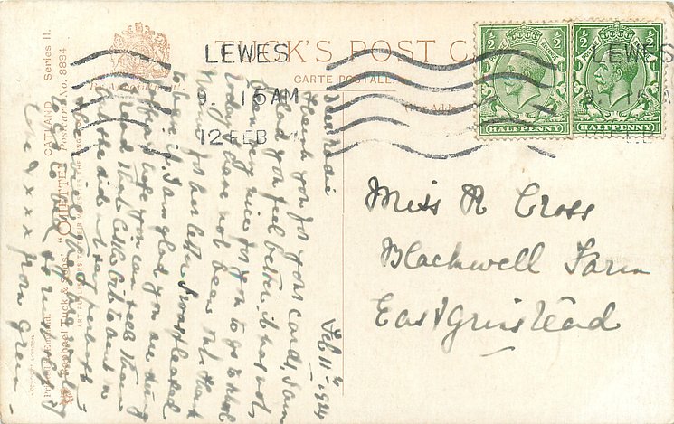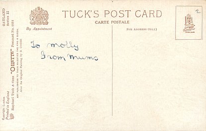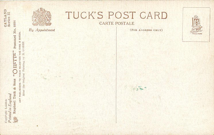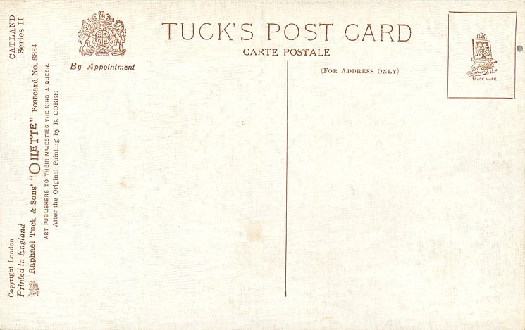 OILETTE, COPYRIGHT LONDON, PRINTED IN ENGLAND or PRINTED IN THE UNITED KINGDOM, come o/f but not so trade named, 3 backs, with or w/o AFTER THE ORIGINAL PAINTING BY B. COBBE., listed in 1926/1927 Postcard catalogue